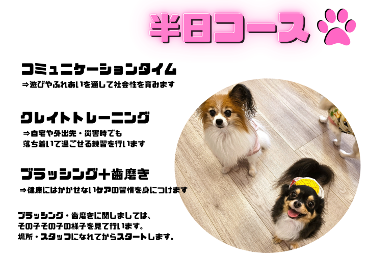 ※その日のクラスの雰囲気や、他のワンちゃんとの過ごし方に合わせて、時間や順番を調整いたします。